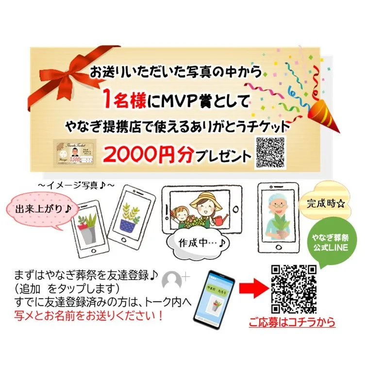 寄せ植えを作ったら、その写真をLINEで送ってください!やなぎ葬祭をLINEで友達登録し、LINEトーク画面に写真とお名前を送るだけでOKです!