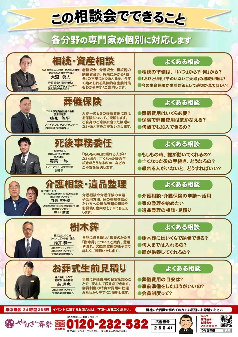 🌸やなぎ葬祭よりご案内🌸 「まだ早いかな…」と思う今だからこそ🌿 将来の不安を“安心”に変える時間を過ごしませんか? __________ 📅4月22日(水) 🕐10:30〜15:00 📍やなぎ会館 松阪斎場 __________ 相続・保険・介護・お葬式など それぞれの専門家にまとめて相談できる 無料セミナー&個別相談会を開催します✨ ✔ 何から始めたらいいかわからない ✔ 頼れる人がいない ✔ 将来の準備を少しずつしたい そんな方におすすめです🌿 __________ 🍱参加者限定【無料ランチ付き(要予約)】 セミナーのみ・相談のみのご参加もOKです◎ __________ 気になる方はお気軽にお問い合わせください🌿 📞0120-232-532